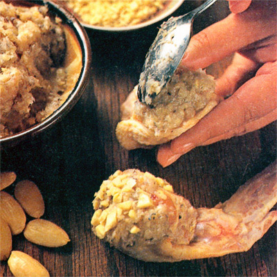 Die Masse in die entstandene Tasche füllen. Mit einem Löffel glatt streichen und mit gehackten Mandeln bestreuen