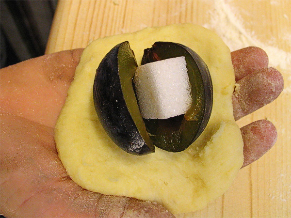 Mit Würfelzucker gefüllte Zwetschge auf Teig legen legen