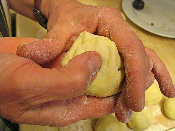 Mit Würfelzucker gefüllte Zwetschge auf Teig legen legen